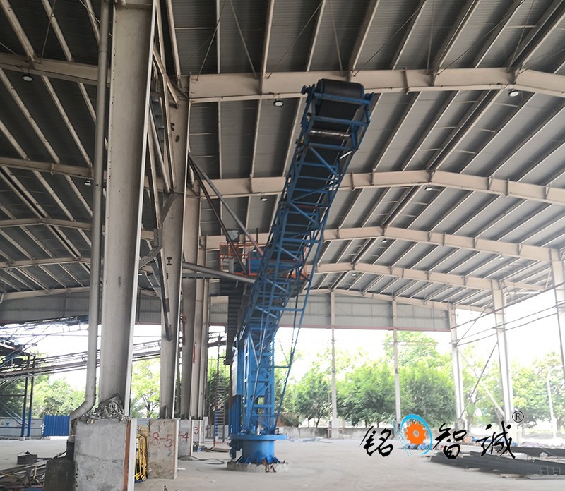 旋轉(zhuǎn)式皮帶輸送機,為散碎物料倉貯輸送設(shè)備,是在安裝有行走輪的支架上部的底盤上安裝一轉(zhuǎn)盤,轉(zhuǎn)盤可相對底盤作旋轉(zhuǎn)運動,皮帶輸送機的進(jìn)料端座在轉(zhuǎn)盤頂部的托盤上,出料端為懸臂式,配重箱在托盤上用以上與懸臂配重,倉貯時,物料通過料斗由輸送帶送至遠(yuǎn)端,推動懸臂即可改變堆積位置,在庫房內(nèi)實現(xiàn)多點堆積而勿需停機和移動機體,連續(xù)作業(yè)省時省力,操作方便,尤其適用于糧食的倉貯輸送。